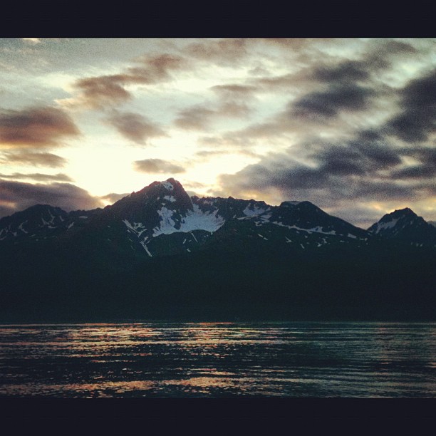 Even though we traveled sixty miles from the Seward harbor, when we stopped over the underwater treasure trove of fish, we still found an array of islands to keep us company, each looming out of the grey that sprinkled a hint of its bounty onto us. Several hours later, after a day of mostly throwing back dogfish and getting to know the strangers who had paid for the charter boat’s services, we headed home. In the morning, when the early hours and the steady rocking of the speeding boat lulled nearly everyone except the driver asleep, I never had a chance to appreciate the scenery we’d passed through. Not on the trip back though. I donned my coat and zipped it tight. I remained steadfast on the deck during most of the time home, silently taking in the mountains of the mainland growing out of the far waters. That was when I snapped the next picture.