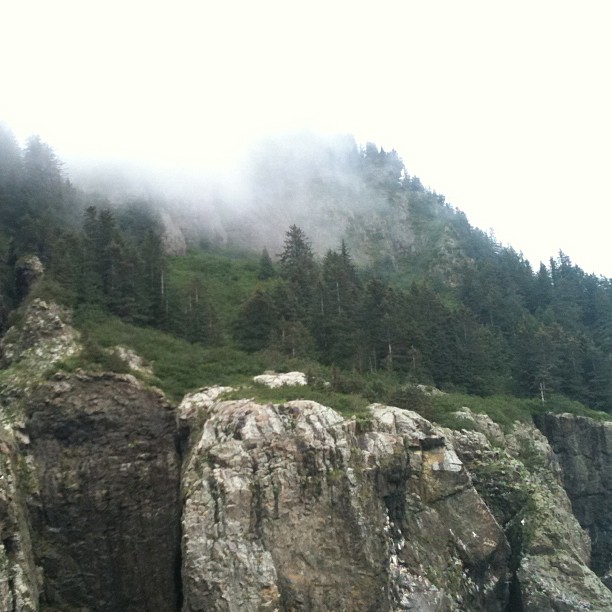 With under an hour left of an otherwise boring boat ride, that’s when the two charter fishermen who weren’t driving sprang into action. They cut, sliced, and harvested the meat from the few dozen fish comprising of the boat’s catch of the day, and as we traveled back through the inlet that hours earlier had been a dark racetrack of water, Alaska granted me fantastic views of the surrounding cliffs and forests with its blindingly bright cover of clouds. My last photo is one such glimpse of what I experienced.