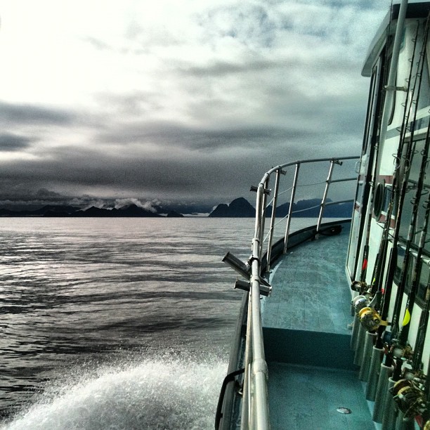The first photo was one I took ten minutes after leaving the Seward harbor, at 5 in the morning. We skimmed along the chilly waters through the inlet leading out to the ocean, and on my left stood those beautiful mountains overshadowed by the rising sun. On the right… you guessed it, more mountains. For an hour these intimidating monstrosities protected us from the world beyond, and once we broke free and flew through choppy waters and overcast skies, it took another three hours to reach the spot where the halibut were biting.